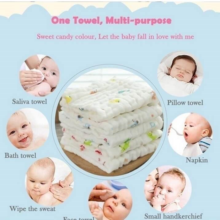 Kan brukes til å spise, vaske ansiktet, bade, bleiehåndkle, putehåndkle og som smekke