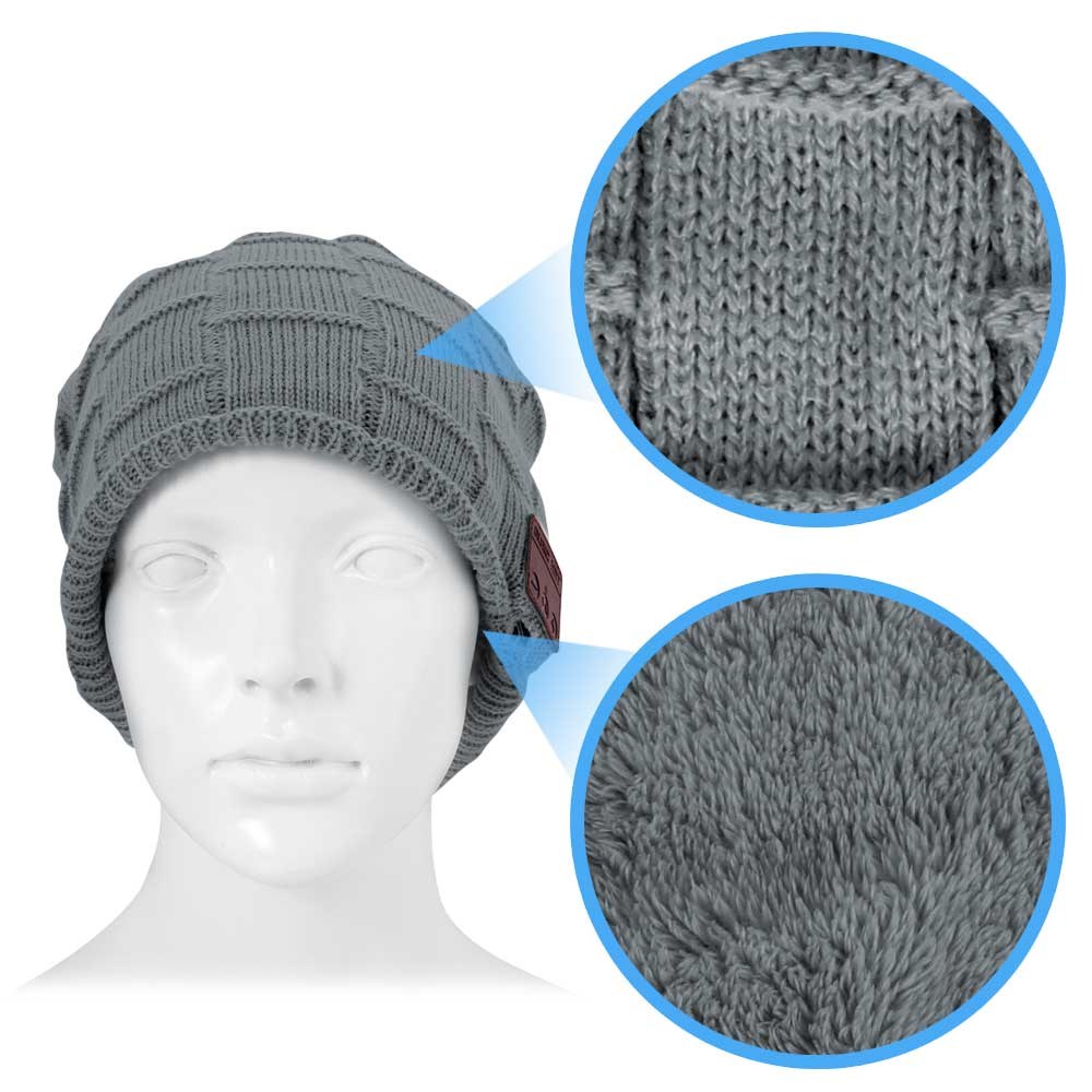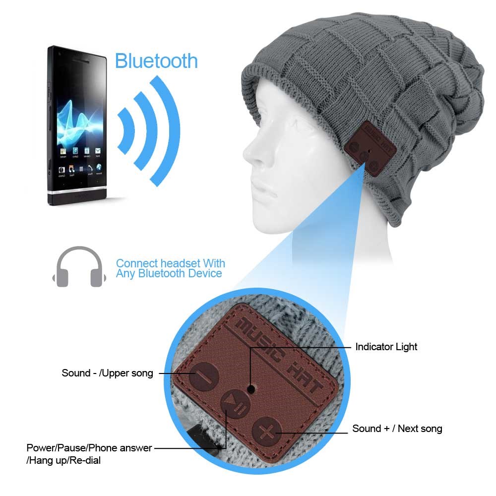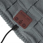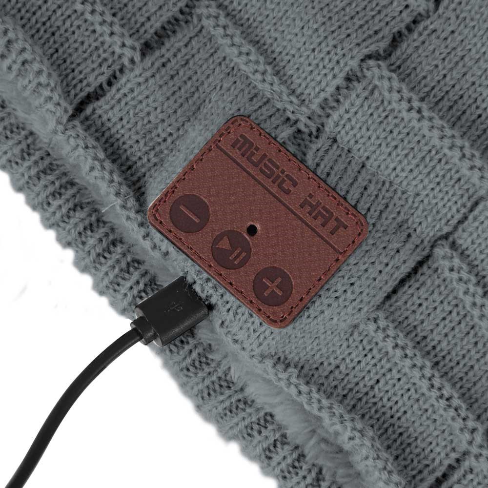 Music Hue med innebygd trådløst Bluetooth-headset! Er det en daglig kamp med hatten og hodetelefonene. Er denne hatten løsningen. Den har et innebygd trådløst Bluetooth-hodesett, og du slipper bryet med kabelen. Du kobler til smarttelefonen eller annen spiller med Bluetooth-funksjon, og du kan både snakke i telefonen og høre på musikk mens telefonen ligger i vesken. Du styrer musikken og samtalene via et kontrollpanel på siden av hatten. En USB-kabel følger med, og du må huske å lade den slik at den er klar til bruk. Luen er i akrylstrikk og fôret med plysj, noe som gjør den supermyk og varm. Luen er one size, ekstra lang, og kan brukes av alle.