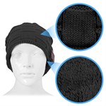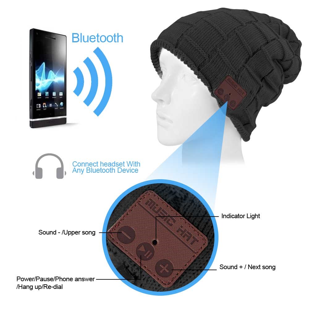Music Hue med innebygd trådløst Bluetooth-headset! Er det en daglig kamp med hatten og hodetelefonene. Er denne hatten løsningen. Den har et innebygd trådløst Bluetooth-hodesett, du slipper bryet med kabelen. Du kobler til smarttelefonen eller annen spiller med Bluetooth-funksjon, og du kan både snakke i telefonen og høre på musikk mens telefonen ligger i vesken. Du styrer musikken og samtalene via et kontrollpanel på siden av hatten. En USB-kabel følger med, og du må huske å lade den slik at den er klar til bruk. Luen er i akrylstrikk og fôret med plysj, noe som gjør den supermyk og varm. Luen er one size, ekstra lang, og kan brukes av alle.