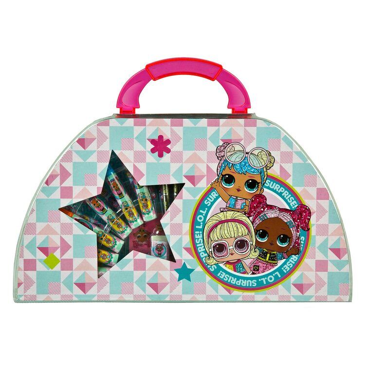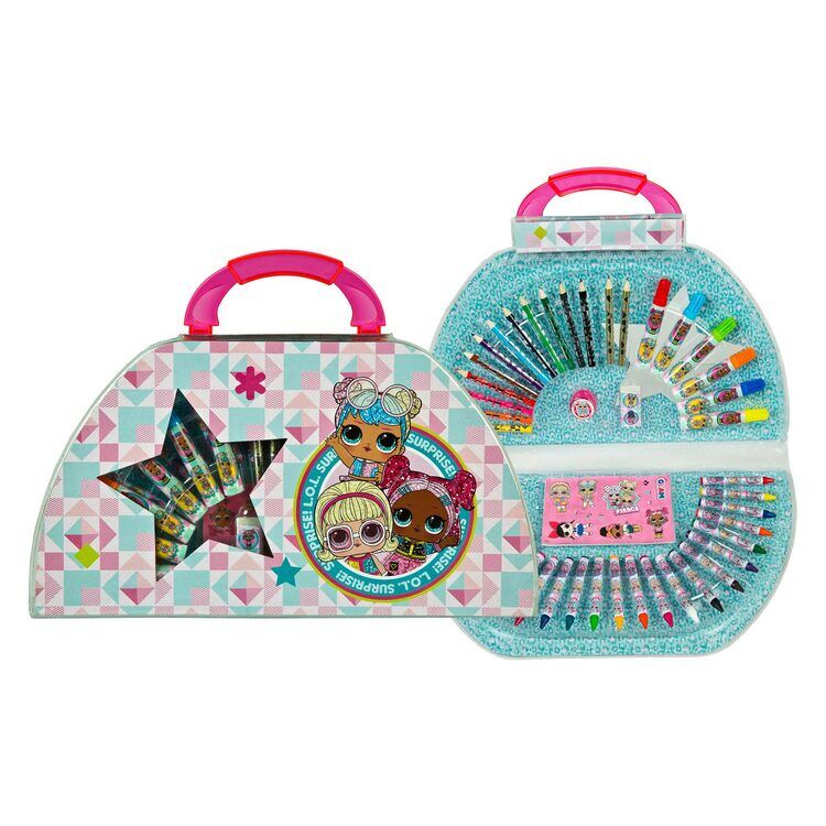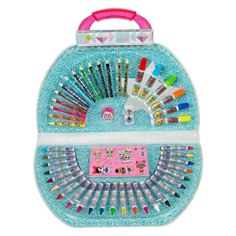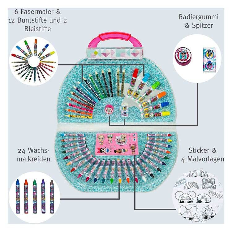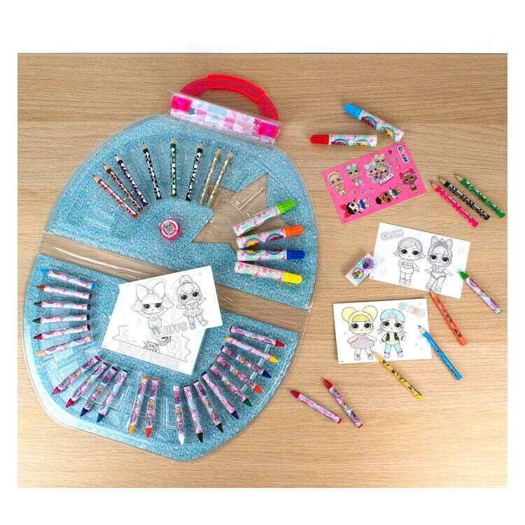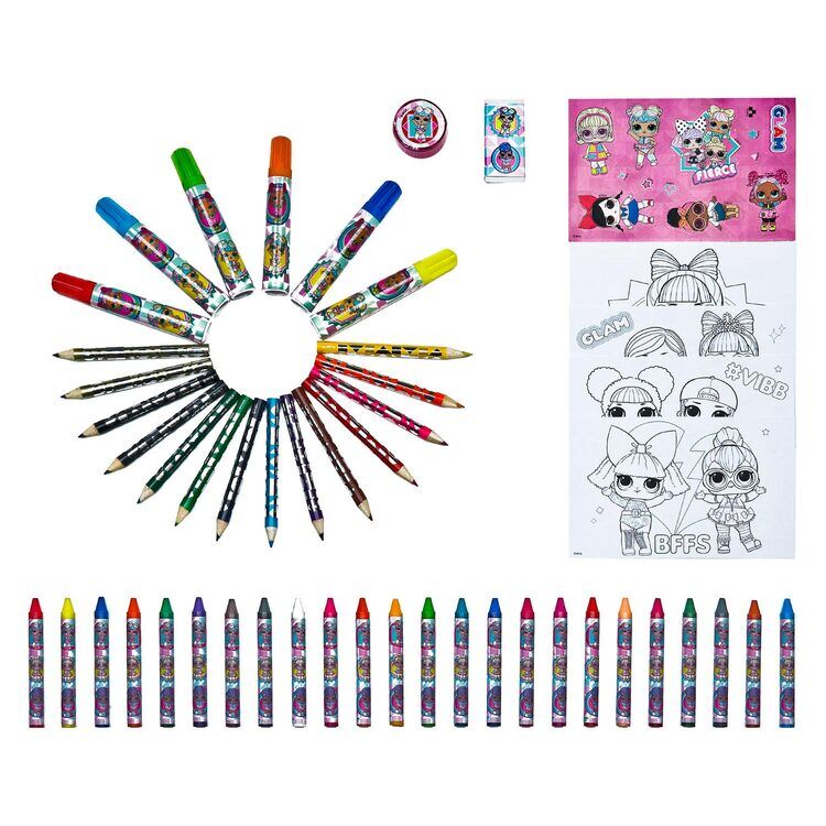 LOL. Overraskelse! Fargeleggingskasse, 51 deler. Inneholder: fargeblyanter, tusjer, voksstifter, klistremerker, blyantspisser og viskelær. Størrelse: 38 x 22 centimeter. Egnet for barn fra 3 til 8 år.