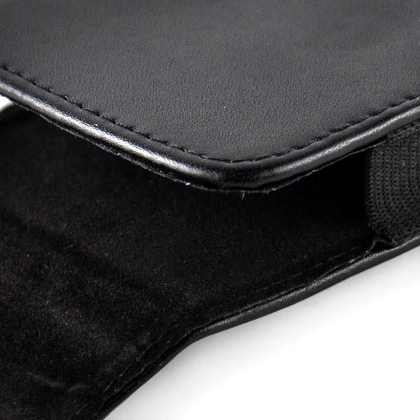 Belteposen er laget av imitert skinn og holdes sammen av elastisk stoff. Når du lukker dekselklaffen, forblir den lukket med magnet.