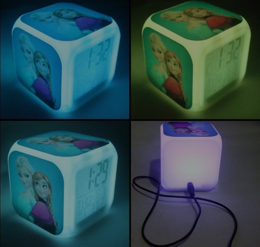 Barnevennlig klokke med pikachu på, som begge kan lyse i forskjellige farger, brukes som alarm og skjermgrader. info: - Materiale i plast
